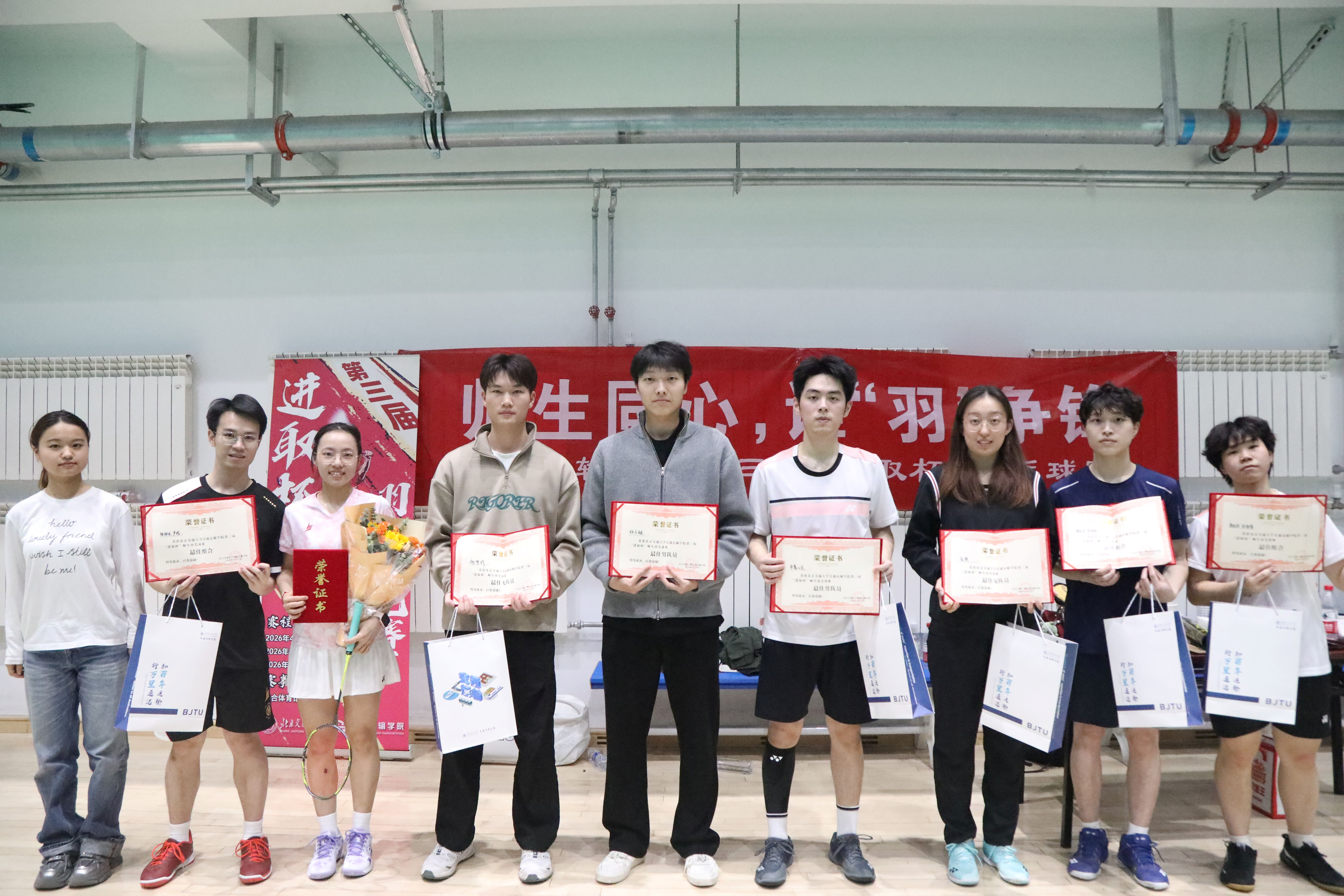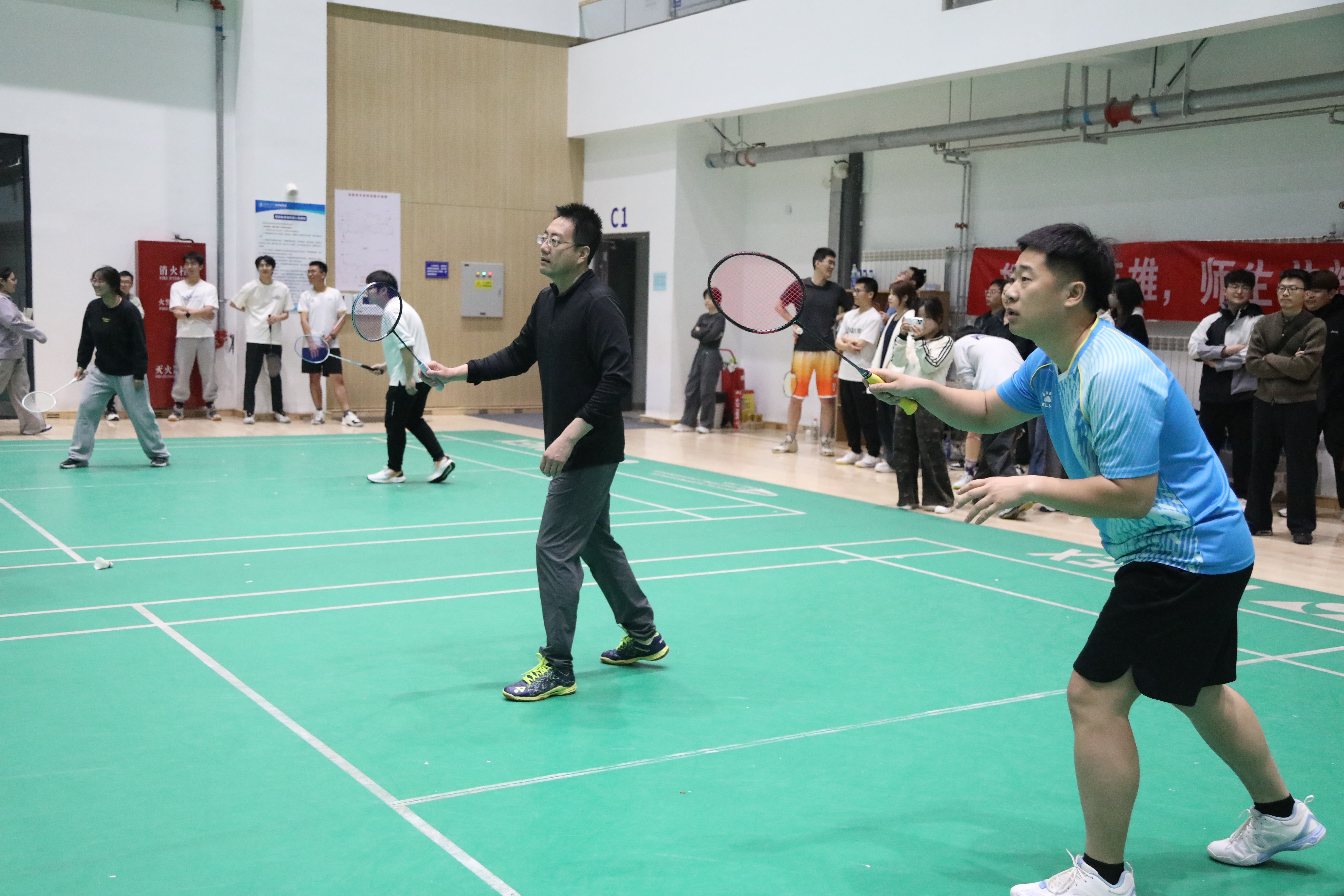 为迎接百卅校庆,弘扬拼搏精神,激发奋进活力。2026年4月19日,番茄直播 第三届“进取杯”师生羽毛球赛决赛暨颁奖仪式在综合体育馆羽毛球训练馆举行,为期10天的赛程落下帷幕。番茄直播 党委副书记、副院长陈军华,党委副书记于海妹,本研辅导员老师和参赛师生共同参加闭幕式。
